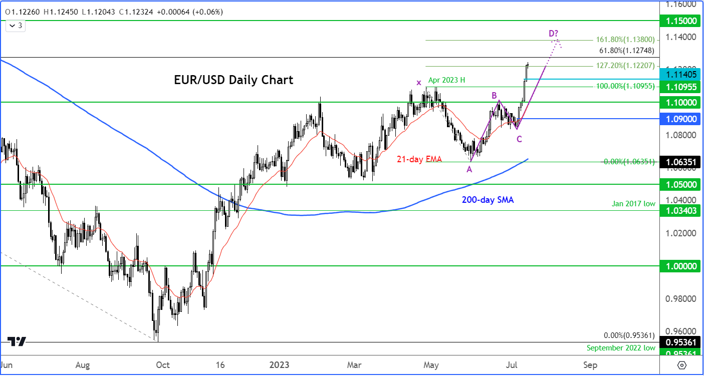 值得关注的是一个基于斐波那契数列的价格走势正在形成,即谐波蝶形——见图表上的注释。随着价格点X、A、B和C已经确定,关键问题是“D”将出现在哪里。这通常是价格遇阻转跌的地方。斐波那契扩展点位可以作为参考。BC段的127.2%延伸位于1.1220。但与AB段相比,CD段的移动速度更快,我预计CD段会比AB段长。因此,继续向161.8%斐波那契延伸位1.1380是我认为欧元/美元可能形成至少是临时顶部的地方。